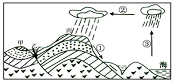 读某地地质剖面示意图,回答问题。(14分)![]() (1)写出图中甲、乙、丙的地质构造类型:(6分) 甲 ;乙 ;丙 ; 丙处的地貌类型为 ,其形成原因是 。 (2)若该地区富含石油、天然气,应在甲、乙、丙三处中的 处开采合适。(1分) (3)下列各序号所代表的水循环的环节分别是:(4分) ① ,② ,③ 。 与环节②相符的是