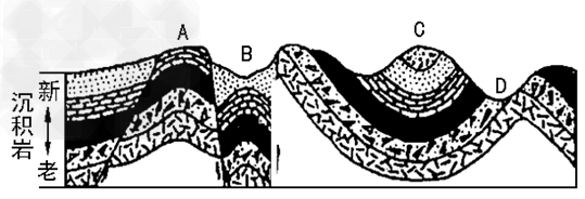 (1)C ;D ; B ;A (2)山地;向斜槽部受挤压 ,坚硬不易侵蚀,保留下来成山 (3)B ;A (4)C ;D |