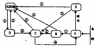 图为“岩石图物质循环示意图”。读图回答题。![]() 小题1:图中B、D代表的岩石分别是 ( ) A.侵入型岩浆岩、沉积岩 B.沉积岩、侵入型岩浆岩 C.变质岩、喷出型岩浆岩 D.沉积岩、变质岩 小题2:图中②表示的是 ( )