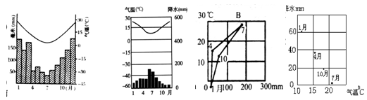 试题分析: 小题1:从图中区域轮廓判断该山脉为南美西侧的安第斯山脉,它是南极洲板块与美洲板块相撞,隆起形成的。故选C。 小题2:从自然带的空间位置可判断,C自然带是温带荒漠带,它是受西侧山脉的阻挡形成的,属于非地带性。故选D。 小题3:A属于地中海气候,7月气温最低,气温值高于0°C,雨热不同期,夏季降水少,冬季降水多。对比四副图,符合此特点的是B。故选B。 小题4:图中B处为阿根廷的大牧场放牧业,主要牧牛,其牛肉主要出口到欧洲,所以对国际市场依赖性大。 |