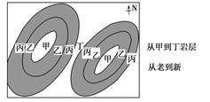 下图为某地某水平面的岩层分布图,读图回答题。![]() 小题1:图中丁处的地质构造为