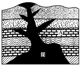 (1)沉积;具有层理构造 (2)图略(C位于地壳上部,D位于岩浆喷出地表处);玄武岩属岩浆岩中的喷出岩,是岩浆喷出地表冷却凝固而成的;花岗岩属岩浆岩中的侵入岩,是岩浆侵入地壳裂隙冷却凝固而成的。 (3)变质 (4)A是沉积岩,沉积岩的岩层在漫长的地质时期一层层堆积而成,岩层中常能找到已经成为化石的古生物遗体或遗迹 (5)A形成年代早,B形成年代晚 |