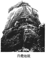 丹霞地貌是中国人自己命名的,由红色砂砾岩构成的具有陡峭坡面的各种地貌形态。它是由红色砂砾岩在风化、重力崩塌、侵蚀、溶蚀等综合作用下形成的。丹霞地貌各个时期的景观类型取决于地面不断抬升、风化与流水作用等因素。读图,回答1~2题。 ![]() |