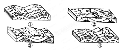 在地质年代较老的褶皱构造地区常出现背斜成谷、向斜成山的“地形倒置”现象。该图为“地形倒置形成过程示意图”,读图完成24~25题。![]() 小题1:按地形倒置形成的时间顺序,下列排序正确的是 ( )