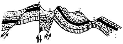 读地质构造图回答。(8分) (1)从地质构造上看 D地属于 构造 分析其地表