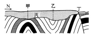 下图为基地地质剖面图,勘探队员观察到,甲处有一自北向南流的河流,东岸冲刷严重。某日,国际标准时10:50时,该地钻孔处旗杆的影子缩为一个点。读图回