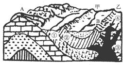 本题考查地质作用。 小题1:图示甲位于河流上游,为流水侵蚀地貌。 小题2:图示①②为沉积岩,则越往下岩层越老,而③为岩浆岩,图示岩浆岩破坏了沉积岩层,说明③形成最晚。 |