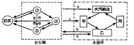 下图表示岩石圈与水循环的关系 ①②③表示三大类岩石 甲 乙 丙为海陆间循环的各个环节 箭头 a b