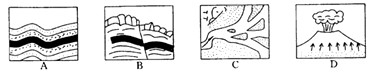 下列各图所示意的地质构造或地貌景观中,主要由于外力作用形成的是![]() |