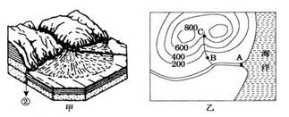 读图,回答问题。(7分)![]() (1)从地貌上看,①处是 ,它是由 作用形成的。 (2)从地质构造上看,②处属于 构造,它是由 而形成的。 (3)在图乙中与甲图中①处位置相同的是 ,C处河谷横剖面往往呈 形。 (4)读图乙,以下叙述正确的是
