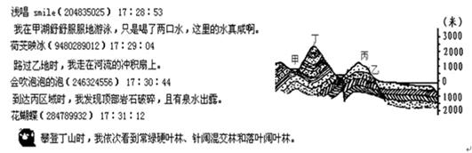 某中学生夏令营到我国南方进行野外考察,区域主要包括下图中的甲、乙、丙、丁四地。考察结束后,部分夏令营队员在QQ群中交流,其中发言最可信的队员是![]()