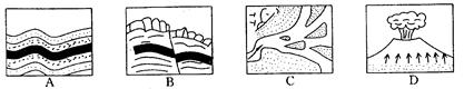 试题分析:地表形态的变化是内力作用和外力作用共同作用的结果。内力作用的能量来自于地球内部的热能,表现为地壳运动、岩浆活动和变质作用等。其中地壳运动引起的地质构造最常见的是褶皱和断层。外力作用主要来源于流水、风、冰川等,通过风力作用、流水作用等改变地表形态。通过上述4图可知:A图为褶皱,B图为断层,C图为流水沉积作用,D图为火山喷发。所以主要由外力作用形成的是C。 点评:本题较为简单,主要考查学生对地表形态变化的内、外力作用的相关知识的掌握情况。 |