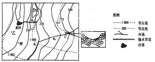 试题分析: 小题1:读图,根据等压线分布情况,可以判断图示为一低压槽,在南半球低压中心左侧为冷锋,冷锋降水在锋后。图示时刻,甲地位于冷锋锋后,乙地位于冷锋锋前,所以甲地降水概率大,A对。结合前面分析,南半球的锋面气旋是顺时针辐合,图示时刻,甲地位于冷气团控制下,乙地位于暖气团一侧,甲地气温低于乙地。B错。根据风的形成原理,始终由高压吹向低压,南半球向左偏,可以分析甲地吹偏南风,C错。乙地吹偏西风,D错。 小题2:读图,根据岩层构造,可以判断L地为背斜谷,A错。图中,R1 是人工开凿的输水管道,中间要经过一段海拔升高的地区,不能自流输水,B错。图示区域为一低压中心,近地面气流辐合上升,C错。根据图中等高线数值看,R2位于山谷,地势较高,西流补给R3,D对。 |