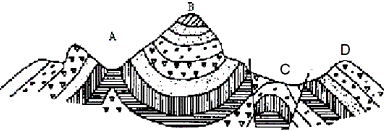 下图A、B、C、D四处,属于背斜的分别是![]() |