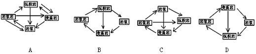 关于岩石圈物质循环过程示意图 正确的是[ ]A AB BC CD D