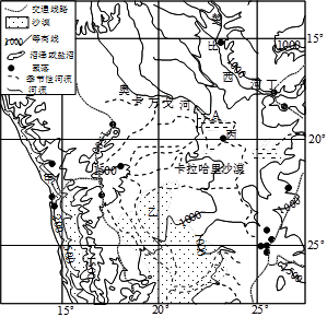 (1)形成过程:A处的三角洲是奥卡万戈河上游流域发生水土流失,土壤被流水侵蚀(2分)进入河流,并通过流水搬运作用(2分)搬运至卡拉哈里沙漠北部的沼泽地,由于流速地形平坦,流速减缓,泥沙沉积形成三角洲(2分) (2)甲地沙漠受到沿岸寒流影响(2分),乙地沙漠则因为处于内陆,且受到周边高原的阻挡,水汽难以进入(2分) (3)丁聚落比丙聚落规模大,发展潜力(前途)大(2分) 丁聚落有附近有河流流经,水源充足,且有交通线路经过(2分);丙聚落处于沙漠地区,水源不足 |