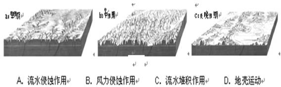 试题分析: 读图可以看到,图示区地表景观先是变得崎岖,沟壑纵横,然后又出现孤山,比较开阔的平地,且有河流流经的痕迹,所以主要受流水侵蚀作用形成,A对。风力侵蚀形成的是雅丹地貌,晚期会出现有孔洞的孤立的石柱,周围是沙漠戈壁,图中晚期有明显的河流痕迹,B错。水流沉积作用出现在洼地,不会出现在山区,C错。地壳运动的结果是使地表变得高低不平,D错。 |