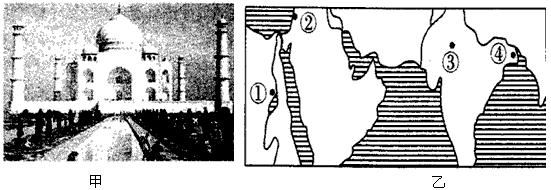 读图甲和图乙,图甲中著名的古代建筑由白色大理石筑成。回答(1)——(3)题。 ![]() |