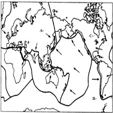 读“六大板块示意图”,完成(1)~(3)题。![]() (1)写出图中字母代表的板块名称:A____________,B____________,C____________。(6分) (2)下列关于板块理论的说法,正确的是( )(2分)