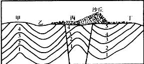 A、该地区地貌主要是受外力作用形成的 B、该地区水资源贫乏是制约其经济发展的长期性因素 C、该地区曾经发生过强烈的地壳运动 D、该地区的地质构造为:甲处是背斜,乙处是向斜,丙处是地堑 |