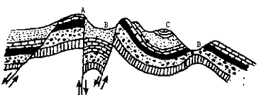 (1)A、B、C、D四处,属于背斜的是______________,属于向斜的是____________。 (2)此时,背斜在地貌上是_____________,原因是_____________________________;向斜在地貌上是 ______________,原因是__________________________________。 (3)找油气应在图中___________处;找地下水应__________处。(填字母) |
