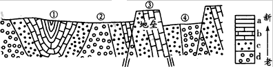 读某地区地质构造剖面示意图 回答问题。(1)图中① ② ③ ④四处 在地质构造上属于背斜的是____