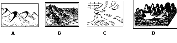 试题分析:A为沙丘;B为冰川地貌;C为河口三角洲;D为喀斯特地貌。符合题意的是D。 点评:本题难度较小。要求学生熟练掌握重要地貌的成因。 |