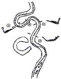 从图中形态可看出,河流出现了河湾,这种现象发生在中游以下,所以应为平原。由图中下方出现河心滩,可知河流的流向应由上向下,①-④河段河流的主要流向应为从西南流向东北。从②处河道断面形态看,左岸(面向河流流向)较陡,而北半球的河流应右岸受侵蚀较陡,很显然不是受地转偏向力影响,而是河道弯曲造成的,左岸为凹岸,受侵蚀,较陡。右岸为凸岸,堆积作用明显,较缓。 |