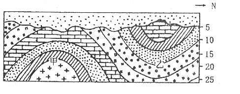 本题考查地质构造和构造地貌。 (1)图示甲处中间岩层向上拱起,为背斜;乙处中间岩层向下凹陷,为向斜;(2)背斜顶部的缺失主要是由于外力侵蚀;乙构造上的上覆岩层是沉积形成的;该地区最初形成皱褶,说明有地壳的水平运动,发生挤压;形成皱褶;背斜顶部的缺失等;之后地壳下沉,地势变低,又发生了沉积作用,而形成上覆岩层; (3)地下隧道适宜建在背斜结构,拱形弯曲能起支撑作用等; (4)背斜储油,向斜储水。 |