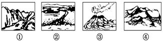 本题考查地质作用。 小题1:图中①是峡谷地貌,由流水侵蚀而成;②是河口三角洲,流水堆积所致;③为火山喷发而形成的火山锥;④是风力堆积作用形成的沙丘地貌。 小题1:③图表示岩浆岩的形成,经①图所示的流水侵蚀作用,最终大量泥沙等碎屑物在河口地带沉积形成河口三角洲(图②)。 |
