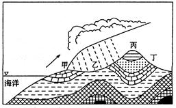 试题分析: 小题1:该地岩层弯曲变形,其地质构造为褶皱;而乙地地势低,属于背斜谷;丙地地势高,属于向斜山;丙、丁之间岩层没有断裂,没有断层。故选A。 小题2:甲乙地降水多,其侵蚀作用主要表现为流水侵蚀;丙地海拔低,不会形成冰川。故选B。 |