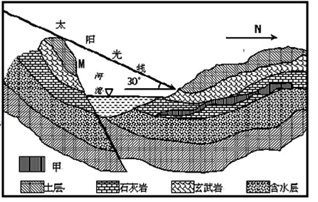 试题分析: 小题1:根据昼夜长短的变化规律,北京昼长最短,可知此时太阳直射南回归线(23°26′S);且此时当地日影最短,可知此时为当地的正午12时,结合正午太阳高度角的计算公式H=90°-︱纬度差︱(所求地点的地理纬度与当日太阳直射点所在纬度之间的差值),“同减异加”,由图此时当地正午太阳高度角为30°,即30°=90°-︱23°26分±当地纬度&︱,由图中可看出,此时太阳位于当地正南方,可知当地位于南回归线以北的地区,可得出当地纬度为34°36′N;此时为当地正午12时,与北京时间差了40分钟,根据每相差1小时经度相差15°,可知当地与北京的经度差了10°,较东的地方时刻早,北京时间所用的是120°E经线的地方时,根据经度分布规律:越往东东经度越大,越往西东经度度数越小,可算出当地的经度为110°E(即120°-10°E),C项正确。 小题2:M处坡较陡,且层理面与坡向一致,因此很容易出现滑坡;该河流所在地的岩层发生断裂并发生相对位移为断层处,是因为断裂面岩层较为破碎,易被流水侵蚀作用而行成谷地;由图可看出河流水位高于含水层的地下水,河流水下渗补充含水层的地下水,因此是河水补给给地下水。而侵入型花岗岩是沉积岩形成以后发生岩浆活动,岩浆上涌穿过沉积岩,侵入到沉积岩,冷却凝固形成的,侵入花岗岩应有岩浆侵入通道,此处可能是化石或其他沉积物;A项表述错误,选择A项。 |