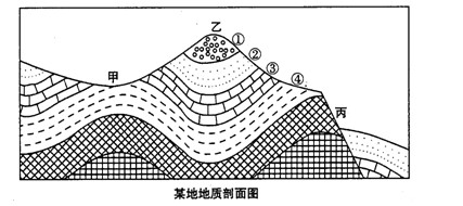 (1)④③②①。 (2)背斜;断层。 (3)甲;乙;丙。 (4)山地;向斜槽部受挤压使岩石坚硬不易被侵蚀反而形成山地。 |
