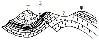 (1)向斜;山地 (2)背斜顶部受到张力,容易被侵蚀 (3)丁 (4)丙 (5)乙 |