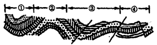 A、①处是向斜,②处是背斜,③④处有断层构造 B、①处是背斜,②处是向斜,③④处反映岩石变质状况 C、①处是盆地,②处是山峰,③④处反映了地壳的水平运动 D、①②处是火山活动造成的地形,③④处将形成山地 |