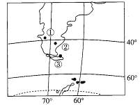 小题1:从图中大陆的轮廓及经纬度可以判定③为南美洲的火地岛.位于南极洲板块与美洲板块交界线附近.多火山、地震,所以选项C正确。 小题2:由于安第斯山脉的阻挡,②地处于雨影区.气候干燥,形成温带荒漠带,是非地带性因素地形引起的.所以选项D正确。 |