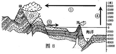图5为亚洲东岸某地海陆分布剖面示意图,读图回答10~11题。![]() 小题1:关于甲、乙、丙、丁四处的叙述,正确的是 ( )