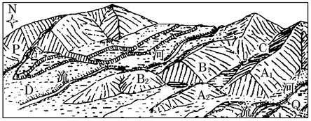 读图回答下列问题。(14分)(1)图中A、B、C、D四处,属于背斜的是,属于向斜的是。(2)图中A处的地形是,成因是。B处的地形是,成因是。(3)如果修建