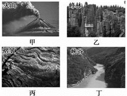 左图为岩石圈物质循环示意图,图中Ⅰ、Ⅱ、Ⅲ分别代表沉积环境、熔融环境和变质环境,箭头线代表不同的地质过程。读“地貌景观图”,图中景观与成因组合正确的是 :![]() ![]()