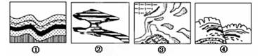该图所示的地质构造或地貌景观中 在我国西北地区比较常见的是: ( )A.①B.②C.③D.④