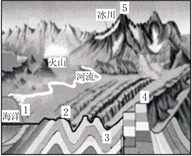读 “某地地貌和地质剖面示意图”。回答1~2题。![]() 1.据上图判断,下列叙述正确的是 A.①为流水搬运和沉积作用形成的冲积扇 B.③处可能有丰富的石油、天然气资源 C.⑤为冰川搬运和堆积作用形成的山峰 D.④为岩块断裂上升形成的山地,②为背斜成山 2.关于图示地区地理特征的叙述,最确切的是 A.图中火山喷发形成沉积岩 B.图中河流既参与海陆间水循环也参与内陆循环 C.⑤山自山麓到山顶依次出现热带雨林到积雪冰川带 D.图中河流上游聚落应选择在地势较高的山坡上,以免受到洪水威胁 |