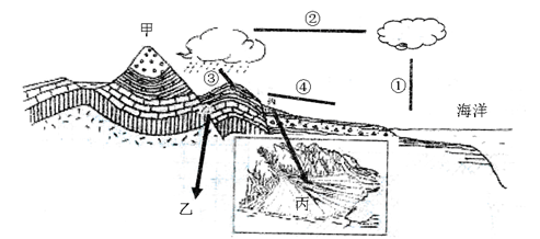 读下面的“地质构造剖面图”,回答下列问题。(10分)![]() (1)在图中①②两处标出箭头,表示水汽运动方向。 (2)水循环中①是 环节,②是 环节,③是 环节,④是 环节。 (3)甲地的地质构造为 ,乙地的地质构造为 。 (4)形成丙处地貌的地质作用是 (选择填空)。