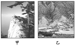 读下面景观图片 回答1—2题。1 甲图景观的形成突出反映了[ ]A.地壳的水平运动B.地壳的
