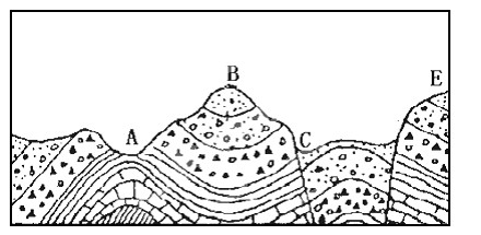 读下图,回答问题。(1)在三大类岩石中,___________在该地区分布最广。图中A、B、C、D四处,属于背斜的是______。(2)图中B处的地形是___________,成