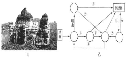 2010年8月 “中国丹霞”被正式列入《世界遗产名录》。图甲为广东丹霞山地貌景观 图乙为地质循环示意