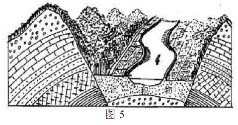 读某地地形和地质构造示意图图5 完成图中河谷地形的成因是( )A.背斜顶部受张力 受流水侵蚀作用