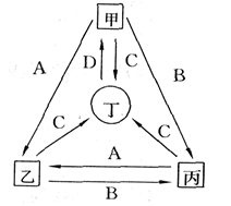 本题考查读图分析能力(地质作用)。 (1)根据三类岩石都能生产岩浆,判断丁表示岩浆,则甲表示岩浆岩,乙表示沉积岩;丙表示变质岩; (2)根据岩浆和三大类岩石之间的相互转化关系,判断ABCD的地质作用。 (3)B表示变质作用,表示在地下深处的高温高压条件下,已经生成的岩石发生变质作用而形成变质岩;D表示岩浆冷凝作用生成岩浆岩。 |