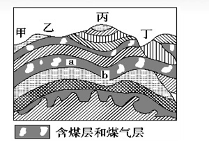 小题1:能够露天开采需要煤炭出露地表,乙丁两处煤层出露地表,但是丁处为断层,开采不安全。所以本题选择B选项。 小题2:根据岩层弯曲判断A处为背斜,容易出现瓦斯爆炸;B处为向斜,容易出现透水事故。所以本题选择A选项。 |