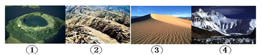 本题考查外力作用及形成的地貌。 小题1:根据图示地貌特征判断,①表示火山口,为内力作用形成的地貌;②为黄土高原的千沟万壑,属于流水侵蚀地貌;③为沙丘,属于风力沉积地貌;④表示冰川侵蚀地貌,故②④都属于外力侵蚀地貌。 小题2:华北平原是由于流水在河流下游沉积而形成的地貌,与③同属于沉积作用形成。 |