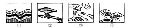 下列各图所示的地质构造或地貌景观 主要由外力作用形成的是[ ]A.①④B.②③C.①③D.②